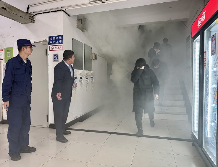 随着警报响起,烟雾点燃,演练正式拉开序幕。根据演练方案的具体人员分工,灭火行动组迅速到达指定地点,通知各楼层宿舍内学生用湿毛巾捂住口鼻后依次撤离至室外安全疏散区。疏散过程中,引导组在各安全疏散通道节点提示学生低身靠墙、有序前行,通讯联络组在各疏散出口引导学生避免拥挤、有序撤离。在工作人员引导下,所有同学均迅速有序地按照预定路线撤离至安全地带。