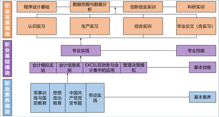 发挥会计专业创新创业中心、财务共享与大数据实验室、校外实践基地等资源优势,构建“认识实习+生产实习+毕业实习+课程实训+创新创业实训+科研实训+综合拓展实训”的立体式实践教学体系,在打牢学生理论基础的同时,注重实践能力的培养和综合素质的提升。