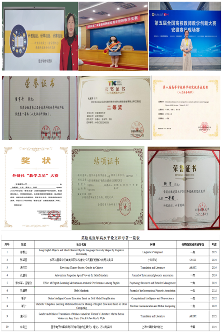 英语专业教师近年来在教研和科研工作中均取得不俗成绩。教师主持包括国家社科基金在内的各类科研项目30余项,出版教材和专著等10余部,发表ESI高被引、SSCI、SCI、CSSCI等高水平论文40余篇,获教育部人文社科优秀成果奖二等奖一项;教师2次获安徽省教学成果奖,多次获全国和省级外语教学比赛、教学创新大赛、青年教师教学比赛一、二等奖;现有省级精品课程及省级一流课程3门,并获批教育部产学合作协同育人项目以及省级优秀教学成果推广项目。