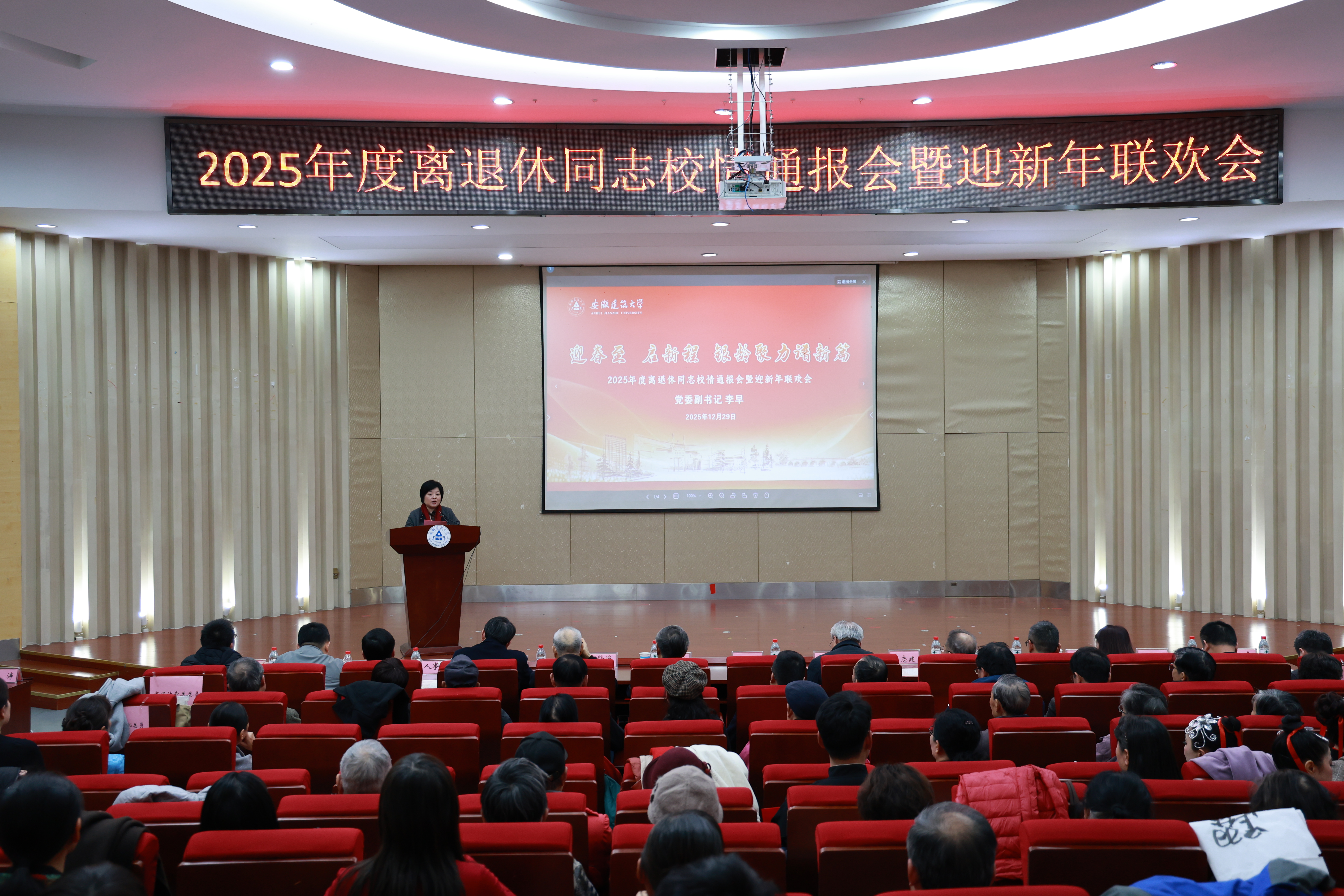 本网讯 12月29日下午,“欢歌飞扬迎春至 银辉传薪启新程”2025年度离退休同志校情通报会、迎新年联欢会暨老年大学教学成果汇报展演在欢乐祥和的气氛中圆满举行。校党委副书记李早,校党委常委、组织部部长吴运传,校党委常委、宣传部部长徐庚阳出席活动,退休老领导胡昭林、刘贤海、胡传健、王志建,办公室、人事处、财务处、国资处、后勤基建处、保卫处、工会、离退休工作处等相关职能部门负责人参加活动,与离退休老同志欢聚一堂,喜迎新春。