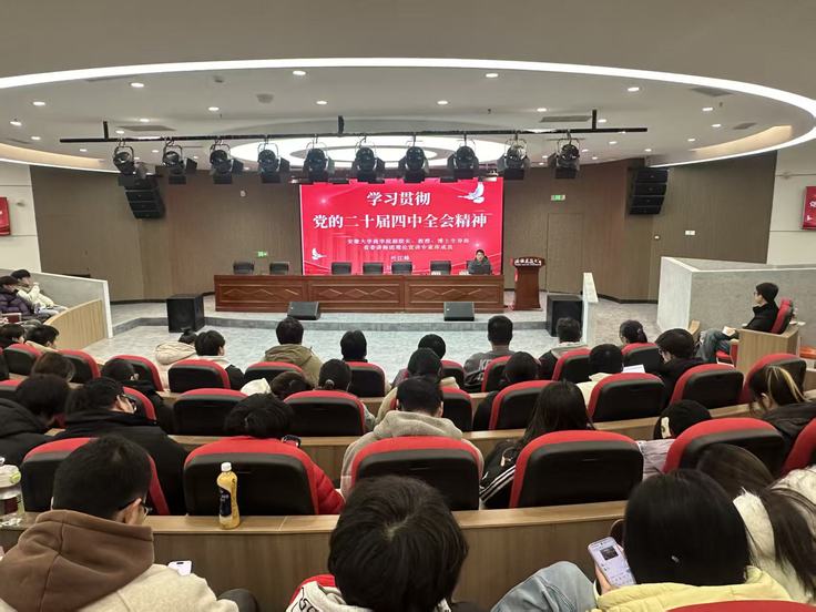 本网讯 为深入学习贯彻党的二十届四中全会精神,全面准确把握全会重大意义、丰富内涵和实践要求。根据省委教育工委和团省委相关工作部署,1月6日下午,学校在徽智楼报告厅举办党的二十届四中全会精神宣讲会。本次宣讲会特邀省委讲师团理论宣讲专家库成员、安徽大学商学院副院长、经济管理国家级实验教学示范中心主任叶江峰教授作宣讲报告。团委党支部全体成员,校、院两级学生骨干100余人参会。