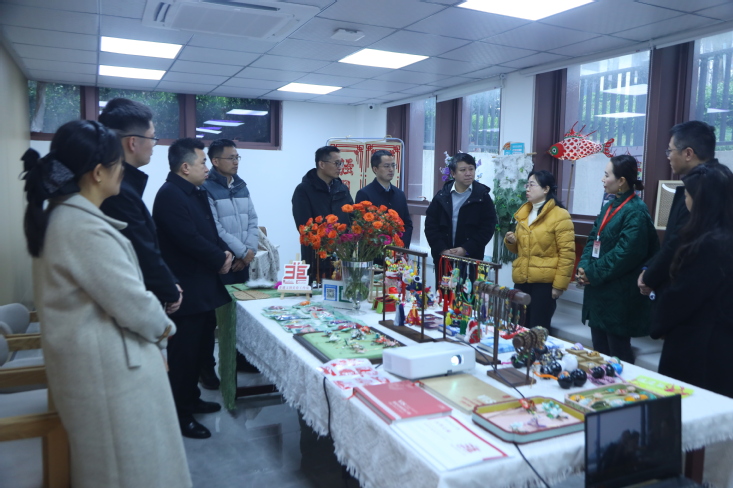 该基地是由学校非遗传承美育俱乐部的师生负责运营,主要传播安徽非遗项目,开办青年夜校,提供各类社区帮扶,在传播传统文化的同时,帮助社区青年提升就业技能,是建大服务社区建设的窗口。陈娟娟一行先后考察了工作室的运营情况,详细了解非遗文化传承与美育实践融合的成果,俱乐部负责人刘琳琳老师汇报了校地双方开展“美育铸魂、实践赋能”主题活动的情况。beats365官方唯一非遗美育俱乐部依托专业优势,将艺术设计等学科特色融入了非遗美育实践。展示了以徽派建筑、庐州木雕、江淮剪纸等地域文化为灵感的系列文创作品,生动呈现了传统技艺与现代设计的创新结合。陈娟娟在参观后充分肯定校地共建模式,强调要通过课程开发、志愿服务、品牌孵化“三位一体”机制,推动青年学子在社会课堂中厚植家国情怀。