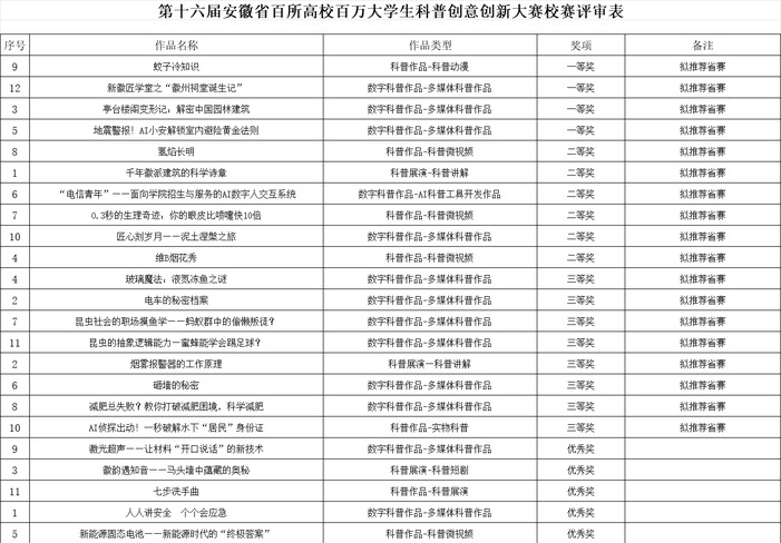 由省科协、省教育厅、团省委主办的第十六届安徽省百所高校百万大学生科普创意创新大赛(简称“双百”大赛)校赛已经结束,经前期动员、学院推荐、专家评审等环节,拟推荐18组项目参加省赛,现予以公布: