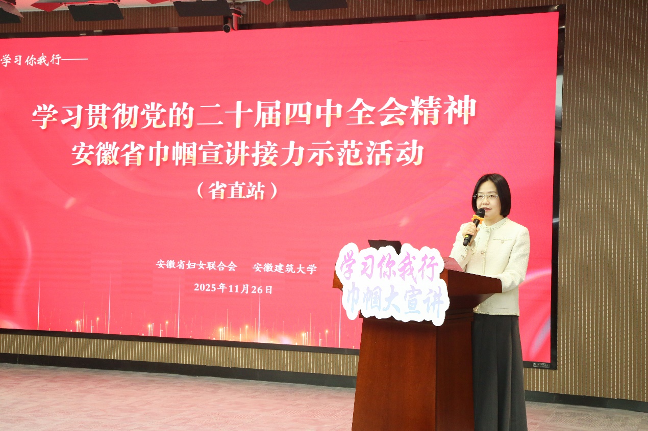 活动开始,李早代表学校向长期以来关心支持学校发展和妇女工作的社会各界朋友表示最衷心的感谢。希望全校女性师生以此次宣讲为契机,认真学习、深入思考、积极践行,把会议精神转化为教书育人、科研创新、成长成才的强大动力,转化为推动学校高质量发展和服务安徽现代化建设的实际行动。也期待以此次活动为纽带,进一步深化与省妇联及各界的交流合作,共同为妇女事业发展、为强国建设民族复兴伟业贡献智慧和力量。