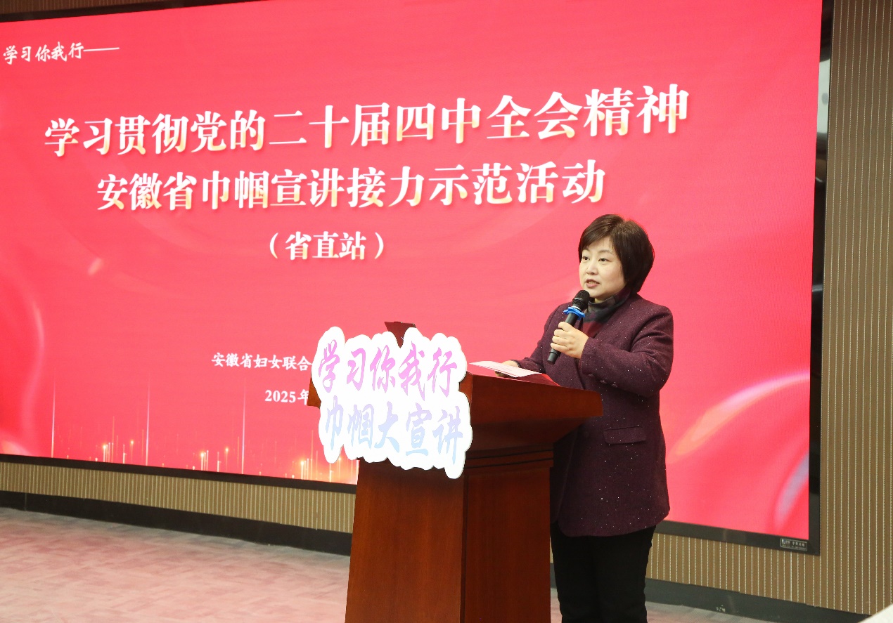本网讯 为深入学习贯彻党的二十届四中全会精神,认真落实习近平总书记在全球妇女峰会上的主旨讲话精神,11月26日,由安徽省妇联主办、beats365官方唯一承办的安徽省巾帼宣讲接力示范活动在徽智楼报告厅拉开帷幕。安徽省妇联党组成员、副主席董志慧,校党委副书记李早出席活动并致辞。省直机关女干部代表、省女知识分子联谊会会员代表、省妇联机关干部代表与beats365师生代表120余人共同聆听宣讲。