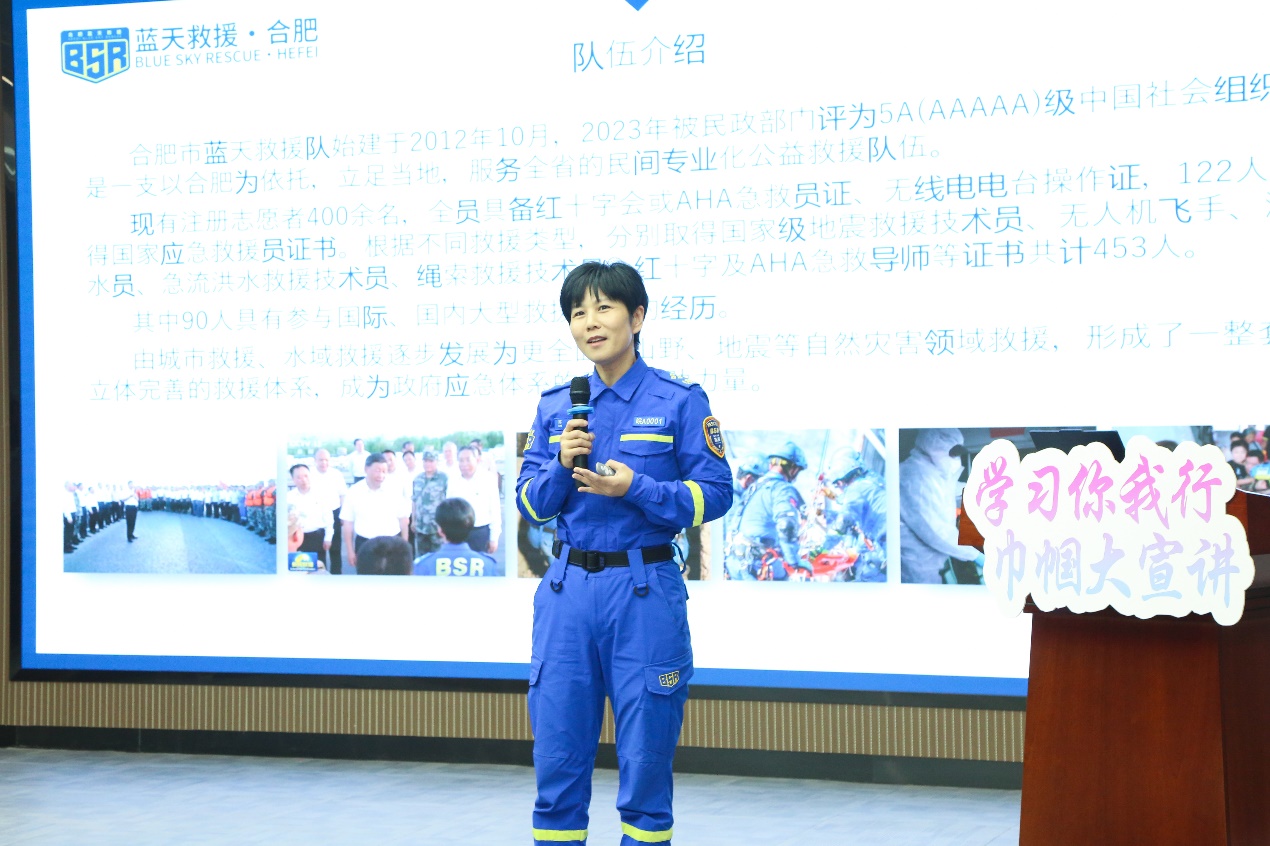 全国三八红旗手标兵、合肥蓝天救援队队长苏琴以《做一束光 照亮别人 快乐自己》为题,深情讲述了参与700余场城市救援、水域救援、自然灾害救援的一线经历。从紧急搜救的惊心动魄到灾后安抚的温情瞬间,她用一个个真实案例诠释了“生命至上”的信念,彰显了新时代女性挺身而出、勇担重任的巾帼风采。