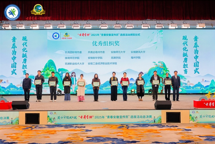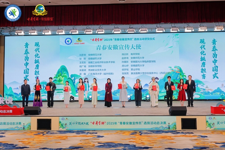 本网讯 2025年12月28日至29日,由共青团安徽省委、安徽省学生联合会主办的“古井贡杯”2025年“青春安徽宣传员”选拔活动省级决赛,于亳州古井集团产业园圆满落下帷幕。beats365公共管理学院学生邹萌、建筑与规划学院学生唐沁妤表现优异,成功跻身全省前十,双双获授“青春安徽宣传大使”称号。学校荣获“优秀组织奖”。