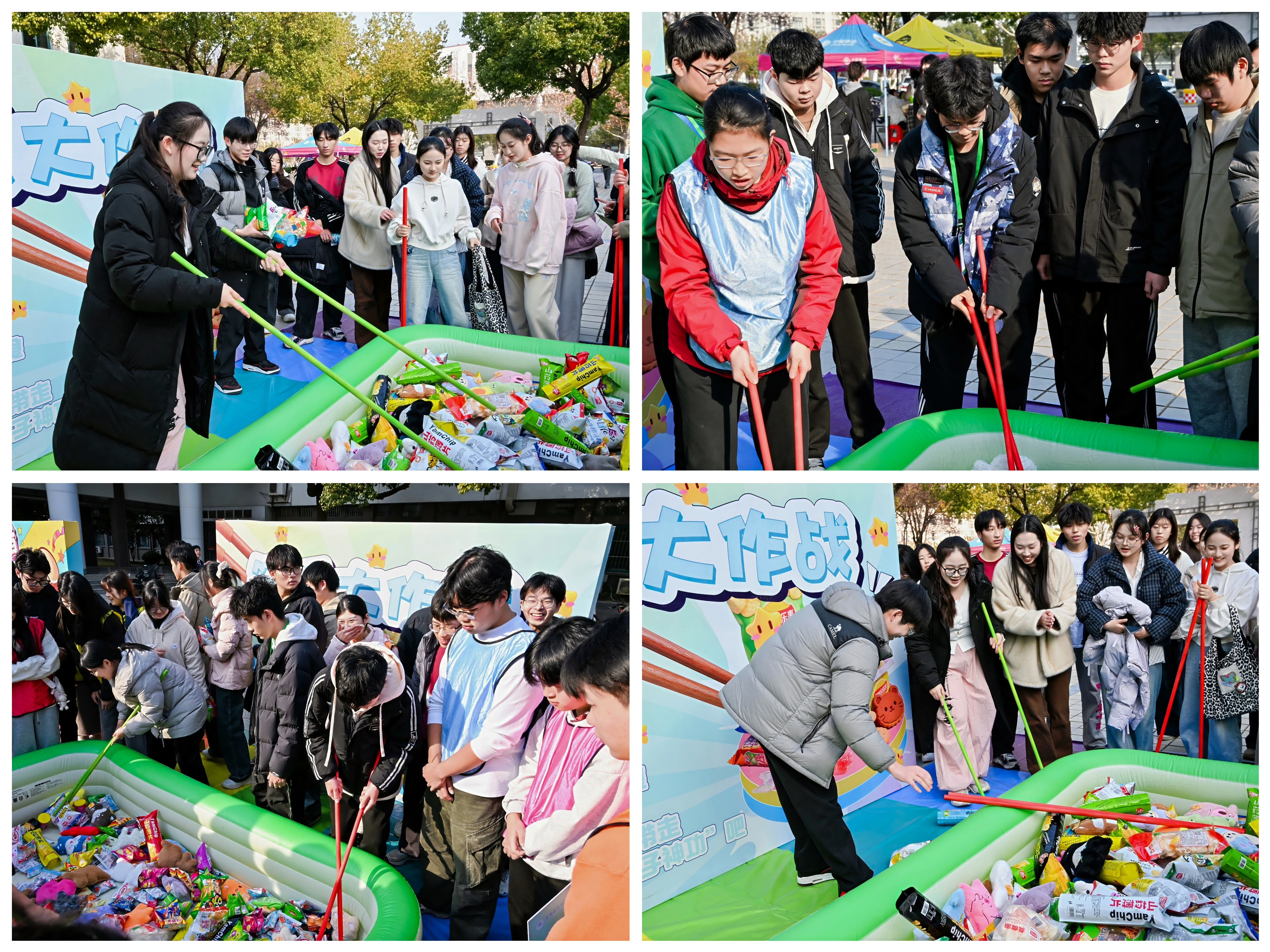 与团队竞赛相呼应的是氛围轻松的自由体验区。“一锤定音”压力释放站前,师生在60秒内将写有负面词汇的道具击飞,畅快宣泄情绪;“‘筷’乐大作战”零食挑战则妙趣横生,参与者使用超长筷子在限定时间内夹取零食,紧张又欢乐。师生在此自由选择、自主参与,在轻松的互动中体验即时快乐,收获一份份充满暖意的小惊喜。