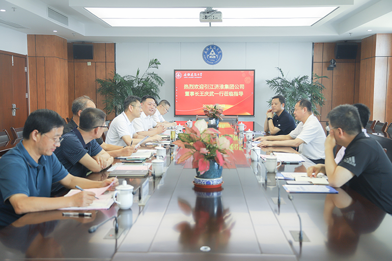本网讯 8月28日,安徽省引江济淮集团公司党委书记、董事长王庆武一行4人来校调研交流。学校在紫云路校区徽风楼21楼第二会议室召开座谈会,引江济淮集团公司党委委员、副总经理胡义文、党委委员、总院公司党委书记、董事长陈立华、办公室主任马志华陪同调研;学校办公室、科技处、科技成果转化处、就业处、合作发展处、继续教育学院等单位主要负责人参加会议,学校党委书记马文革主持会议。