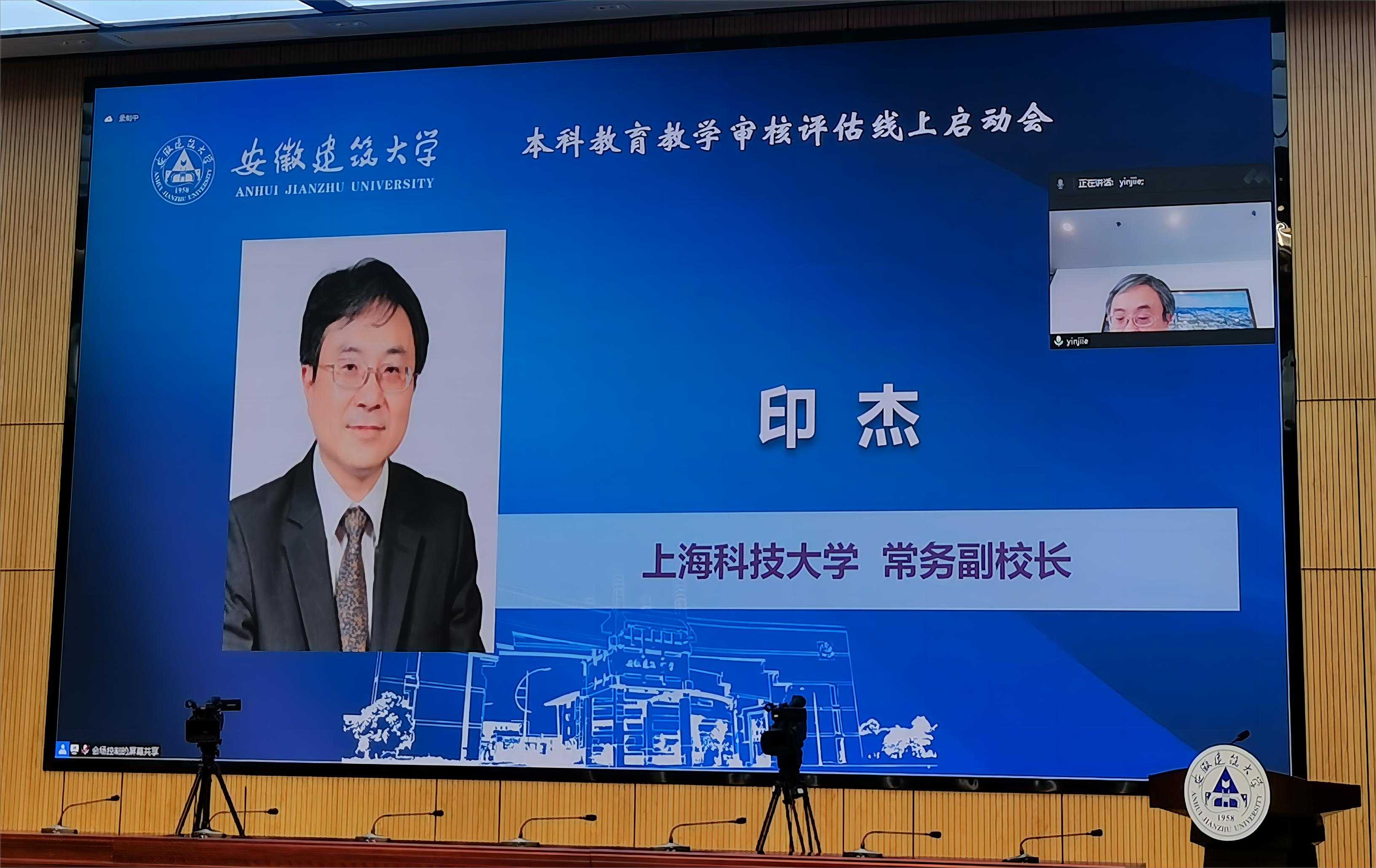 本网讯 5月27日上午,beats365官方唯一本科教育教学审核评估启动会在南校区实训综合楼报告厅举行,会议采用线上线下相结合的形式开展。教育部教育质量评估中心高等教育院校评估处处长盛敏,以上海科技大学常务副校长印杰教授为组长、同济大学原常务副校长陈以一教授为副组长的全体专家组成员及项目管理员、秘书组线上参会;安徽省委教育工委委员、省教育厅副厅长储常连,高教处副处长朱永国,学校党政领导,各职能部门主要负责人、各教学单位班子成员、校督导组成员、教师代表、辅导员代表、学生代表及评建办全体人员线下参会。会议分两个阶段进行,第一阶段由beats365官方唯一党委副书记、校长黄显怀主持,第二阶段由专家组组长印杰主持。