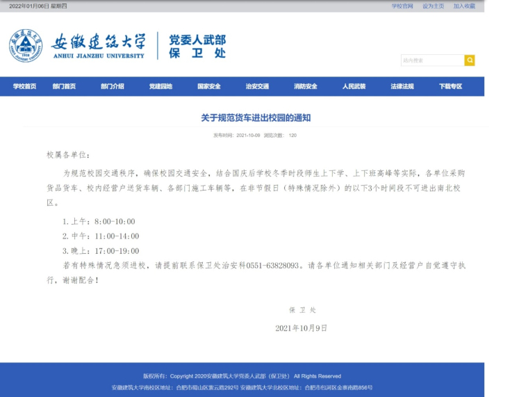 为规范校园交通秩序,确保校园交通安全,校保卫处结合校园环境实际情况对各单位货车出入校园的时间做出具体规范。避免货车在人流密集的时间段出入校园,保证师生的人身安全。