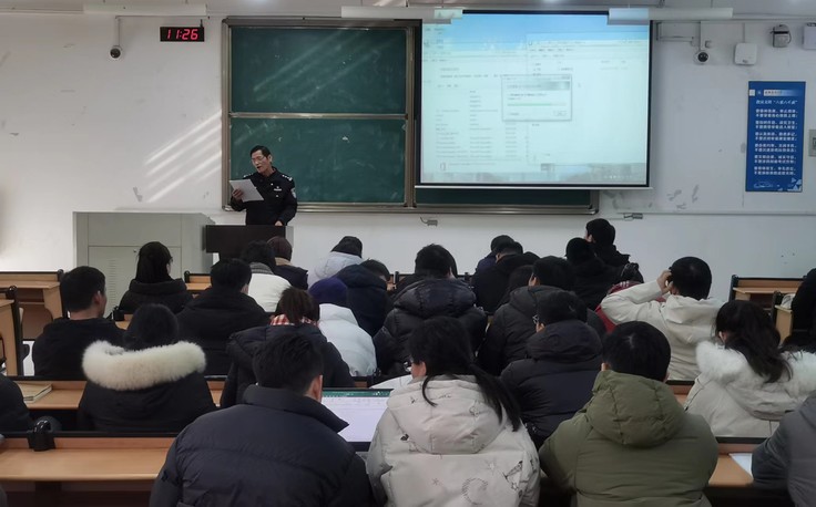 合肥市反诈中心修涛结合高校防范电信诈骗实际,围绕电信网络诈骗主要类型、套路辨别、精准宣传、警示教育等方面,现场讲解如何利用新媒体技术面向当代大学生进行宣教提醒。