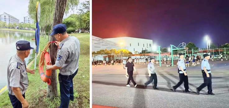 保卫处联合学校为民警务站警察重点围绕学生宿舍、操场、校内水域等区域开展校园安全巡逻,对救生圈及绳索进行检修更换,组织开展防溺水应急演练,加强校园安全联动,保障应急救援力量。