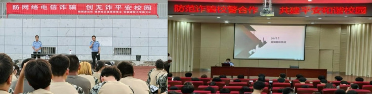 学校精心策划多样化全校师生反电诈集中宣传月教育活动,丰富线上线下宣传手段,增强师生防范意识,提高反电诈辨别能力。一方面,线下邀请民警开展反电诈知识讲座,利用“开学第一课”、主题班会等时机组织学生观看反诈骗警示片和反电诈题材电影《猎屠》,签署防范电信网络诈骗承诺书,发放反电诈宣传册,张贴防诈宣传海报、摆放宣传展板、电子屏滚动显示等形式,让师生深刻认识电信诈骗危害性;另一方面,学校充分利用网络新媒体平台,以《中华人民共和国反电信网络诈骗法》为主线,通过微信公众号“平安安建大”开展反电诈知识答题竞赛活动,组织学生参加安徽省大学生安全知识竞赛,短视频作品征集活动等,定期宣传防范电信诈骗的知识和案例,利用图文、音视频等多种形式,做到人人能警惕、人人会辨别、人人懂宣传,营造全校防范电信诈骗良好氛围。