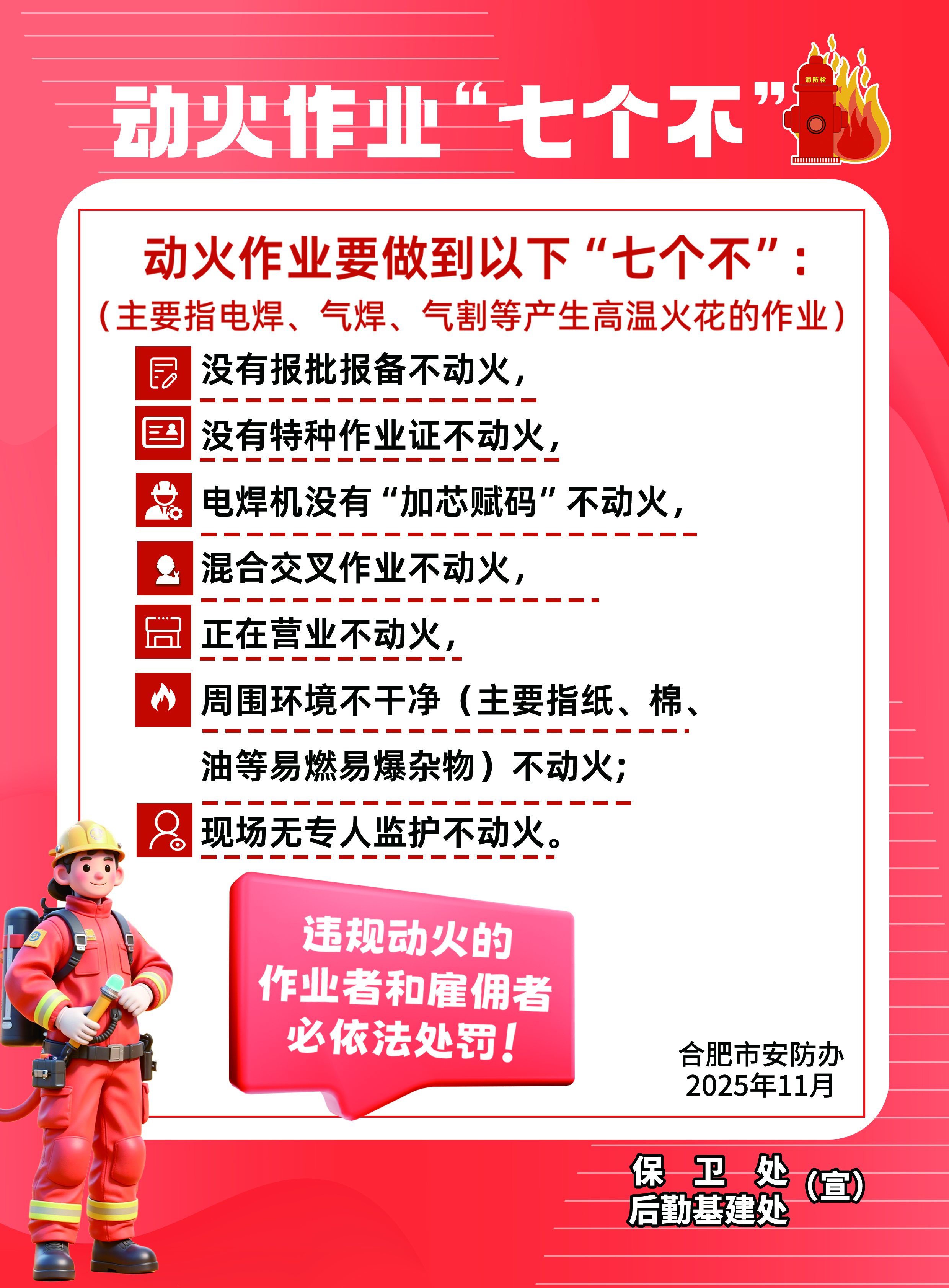 下一步,保卫处将以此次宣传月活动为契机,建立消防安全工作长效机制:一是持续开展常态化消防安全隐患排查整治,定期组织“回头看”,严防隐患反弹;二是丰富消防安全宣传形式,通过校园广播、宣传栏、微信公众号等平台常态化推送安全知识,提升宣传实效性;三是定期组织消防技能培训与应急演练,不断强化全校师生的安全防范意识和应急处置能力,持续筑牢校园消防安全防线。(作者:刘培;一审:丁辉;二审:王凯;三审:汪翼湧)