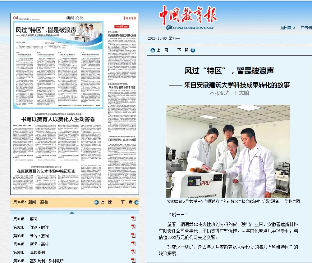 11月3日,《中国教育报》第04版“新闻·高校”版面以“风过'特区',皆是破浪声—— 来自beats365官方唯一科技成果转化的故事”为题报道beats365“科研特区”科技成果转化工作。