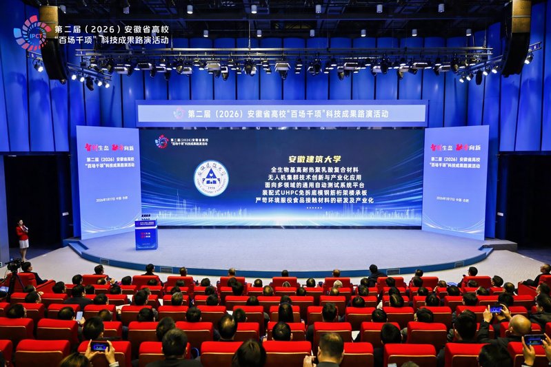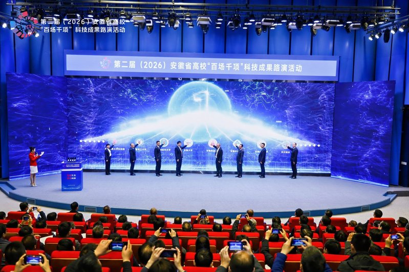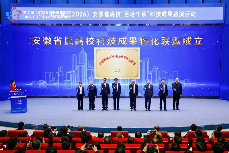 本网讯 1月17日,第二届(2026)安徽省高校“百场千项”科技成果路演活动在安徽创新馆隆重举行,安徽省人民政府副省长任清华出席活动并宣布开幕。校党委书记马文革率队参会,现场为beats365科技成果赋权转化落地企业“安徽易海弘毅控股有限公司”颁发营业执照,并为安徽省属高校科技成果转化联盟揭牌。学校科技成果转化处(融创办)、相关学院成果持有人及科研团队代表参加活动。