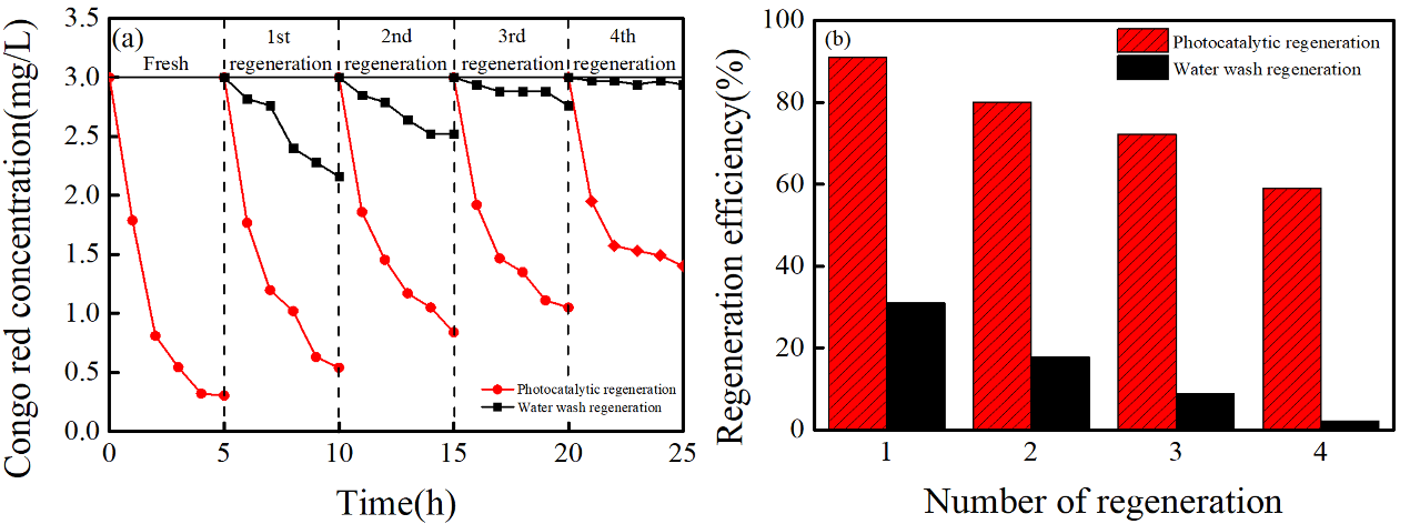 研究团队证明了这种杂化纤维膜材料不仅可以吸附水中污染物(以刚果红和铬离子为例),且能够在可见光照射下进行再生。与洗涤再生的方式相比,可见光催化再生具有节能、环保的特点和更高的再生效率(图2)。