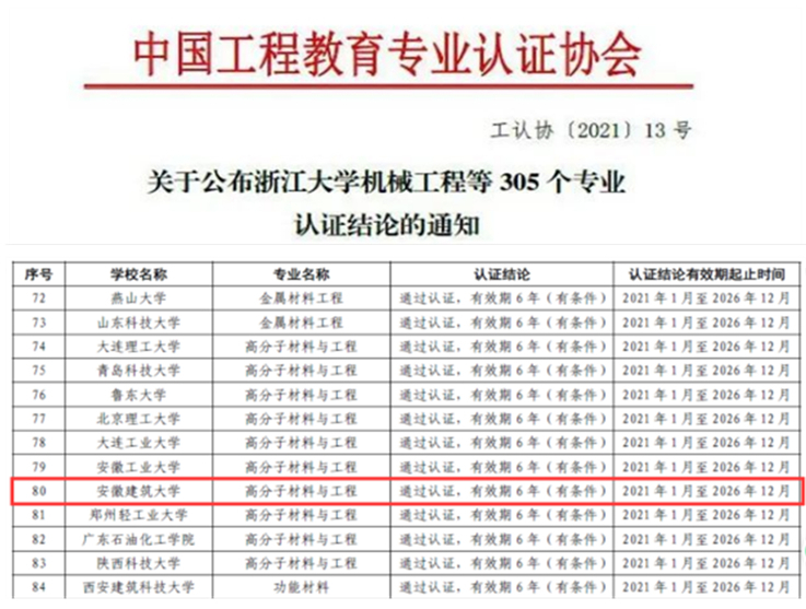本网讯 6月10日,教育部高等教育教学评估中心、中国工程教育专业认证协会正式发布公布了2020年参加全国工程教育专业认证的部分专业认证结论(工认协[2021]13号),beats365高分子材料与工程专业通过了国家工程教育专业认证,有效期6年。这标志着beats365高分子材料与工程专业工程教育体系得到了国际等同认证,毕业生质量达到了行业认可的标准要求。