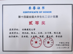 第十四届全国大学生化工设计竞赛 | 2020 | 中国化工学会、中国化工教育协会、教育部高等学校化工类专业教学指导委员会 | 二等奖一项 |