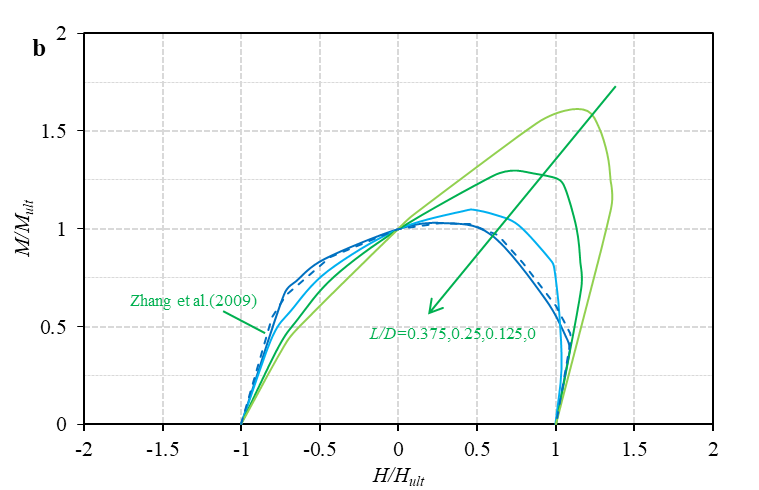 在近海岸油气开采工业中,裙边桩靴基础作为传统桩靴基础的改进形式,可以提供相对较高的承载力和稳固性,以抵抗近海岸恶劣环境所产生的复杂垂直、水平和力矩联合载荷。裙边桩靴基础潜在的承载力等优势有利于移动自升式钻井平台向深水区的延伸。论文采用有限元分析法进行研究,分析了裙边长度和嵌入深度对软粘土中裙边桩靴基础在联合载荷条件下承载力的影响。结果表明,裙边长度和嵌入深度都能显著影响裙边桩靴承载行为,并明显改善联合荷载下的承载力。随着裙边长度和嵌入深度的增加,破坏包络的大小逐渐扩大,其形状也相应发生变化(图 2);当采用0.25D长度裙边、嵌入到大约2D的软粘土中时可以获得最佳的实际应用效果;通过数据拟合获得了代数表达式来解释和预测有裙边的裙边桩靴基础的承载力行为。该项成果将对裙边桩靴基础的设计和实际应用提供初步参考和指导。