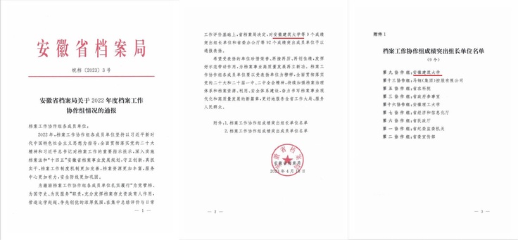 本网讯 4月18日,《安徽省档案局关于2022年度档案协作组工作情况的通报》(皖档函〔2023〕3号)印发,beats365荣获“2022年度档案工作协作组成绩突出组长单位”称号。