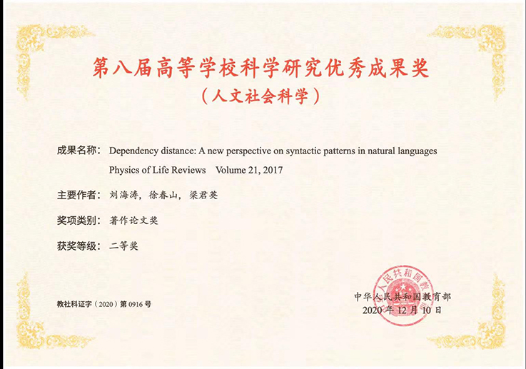 七是政治引领推进学校哲社工作发展进入新阶段。“十三五”期间,学校以习近平新时代中国特色社会主义思想为指导,加强对学校社科工作的政治引领,发挥哲学社会科学在立德树人教育培养中的重要作用,扎实做好新形势下学校哲学社会科学工作。2019年,成立了beats365官方唯一哲学社会科学联合会,充分发挥社科联桥梁纽带作用,协同推进哲学社会科学各学科建设。人文社科类科研项目立项300余项,总经费约960万元。近5年来,学校充分发挥智库作用,主持为省领导决策提供服务的《安徽省房地产去库存应用对策研究》等多项课题的研究工作;主持编制《安徽省建筑业“十三五”发展规划》等4项省住建厅“十三五”专项规划;发布政策、咨询报告6份。在疫情防控及疫后恢复经济社会建设、健全国家应急管理体系、完善重大疫情防控救治体系、健全应急物质保障体系等方面开展研究,完成并上报7份高质量研究报告至安徽省委宣传部。2020年底beats365徐春山教授与浙江大学刘海涛教授、梁君英教授合著的论文“Dependency distance: A new perspective on syntactic patterns in natural languages ”获第八届高等学校科学研究优秀成果奖(人文社会科学)交叉学科二等奖。