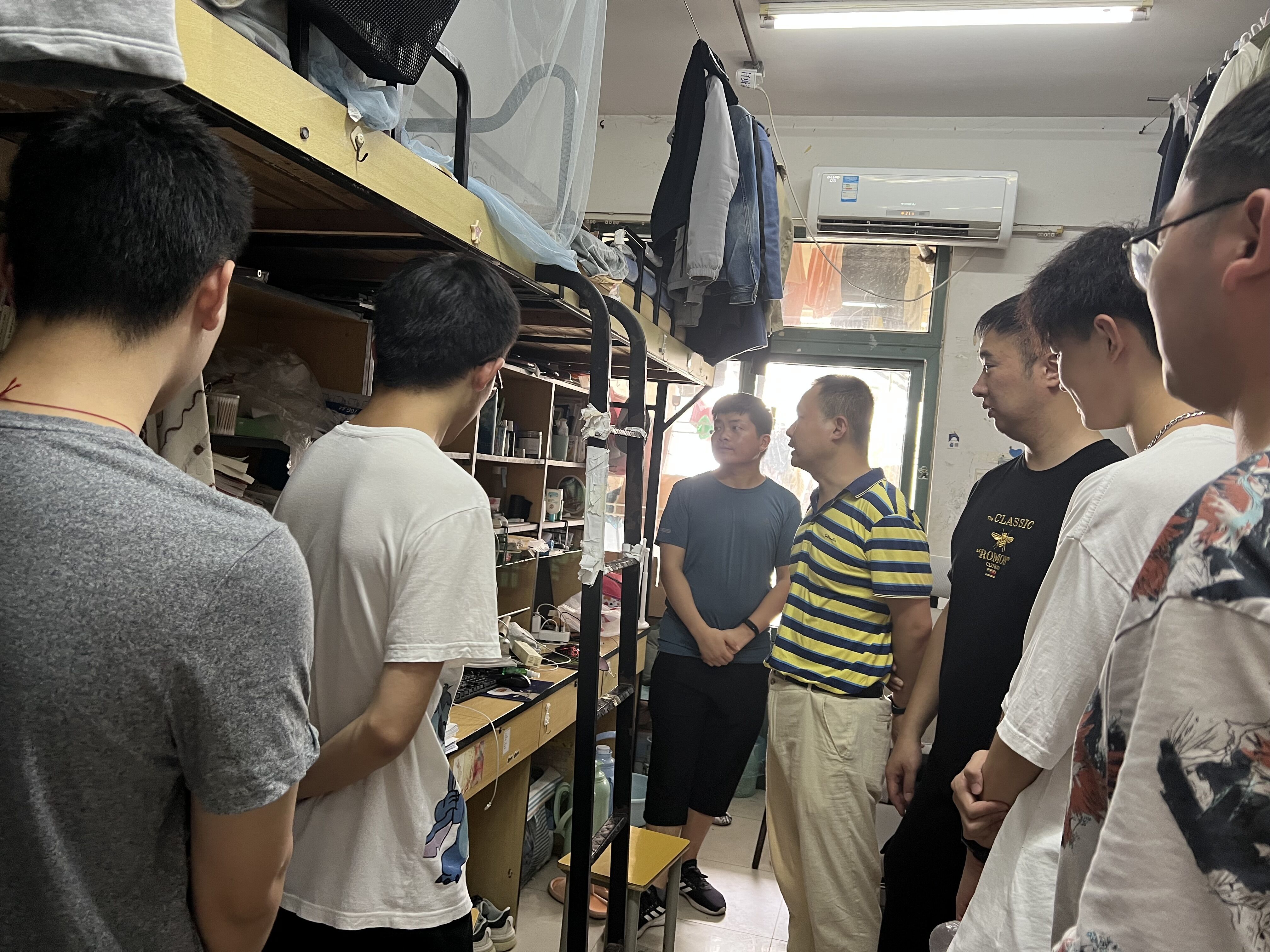 在宿舍里,各辅导员了解学生留校期间的学习与生活状况,询问大家有什么困难和需求,表示学院和老师会为他们提供全面的服务和充分的后勤保障,并叮嘱同学们要科学合理的安排暑期在校学习和生活,严格遵守校园疫情防控要求,注意个人安全,注意做好防暑。同时,勉励大家克服困难,充分利用时间,潜心学习,为考研和工作做充分准备。