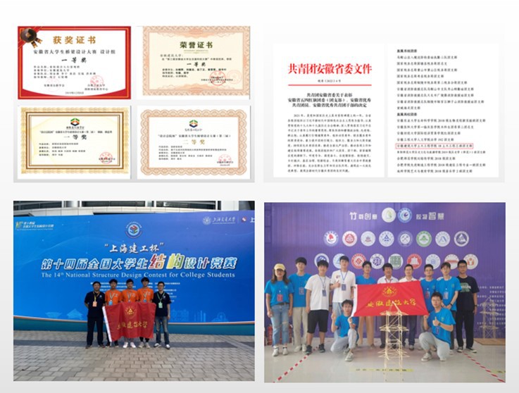 学院积极探索“党建+”模式,充分发挥党组织的政治引领、组织引领,激活人才培养的“红色引擎”。学院积极组织并指导学生开展创新创业训练和实践,近年来共获得国家级、省级竞赛奖项130余项,其中,获大学生结构设计竞赛国家级3项、省级3项;全国周培源大学生力学竞赛国家级1项、省级60项;“互联网+”大学生创新创业大赛省级4项;“挑战杯”全国大学生系列科技学术竞赛省级3项;安徽省百所高校百万大学生科普创意创新大赛1项;大学生数学建模竞赛省级11项;安徽省大学生桥梁设计大赛10项。李元星同学获2020年度安徽省优秀共青团员称号;2018级土木3班团支部获2021年度安徽省“五四红旗团支部”称号。优化研究生培养体系,制定了研究生培养、学风建设与学术道德等方面规章制度,初步建成了博士研究生课程体系和实践教学条件。与中国科学院合肥物质科学研究院、合肥综合性国家科学中心能源研究院(安徽省能源实验室)等单位共建“安徽省首批研究生联合培养基地”。近年来,研究生参与各类科研项目380余项,发表学术论文近300篇,授权专利50余项,获省部级及以上学科竞赛奖励60余项,22人获研究生国家奖学金,毕业生90%以上从事本学科相关行业工作。