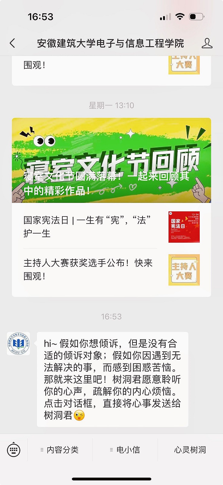 为了引导学生诉说心声,合理排解压力,关注自身心理健康,近日,心理辅导站在学院微信公众号开辟“心灵树洞”专栏,全院联动,给学生提供表达心声、诉说烦恼的空间,为学生减轻压力、解除烦恼。