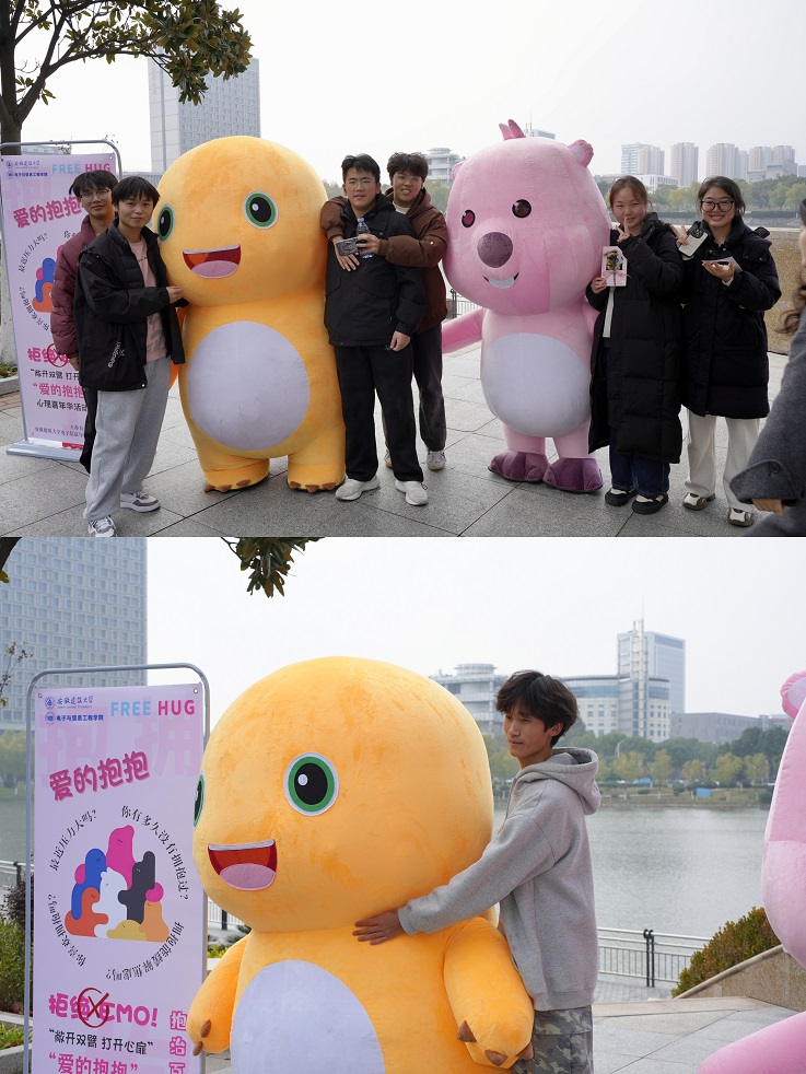 活动一开始,就迎来了“治愈系玩偶拥抱派对”活动。现场布置了两个可爱的大玩偶,不仅外观萌趣,更承载着满满的正能量。同学们纷纷上前与玩偶拥抱,并与之合影留念。在拥抱的过程中,玩偶的柔软与温暖仿佛能治愈一切疲惫与不安,让同学们在拥抱中感受到来自心底的安慰与力量。