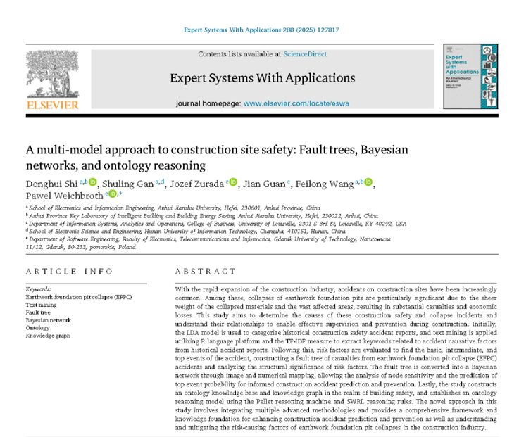 本网讯 近日,beats365官方唯一电子与信息工程学院教师史东辉和模式识别与智能系统专业2021级研究生甘书灵、2022级研究生王飞龙的最新研究成果《A multi-model approach to construction site safety: Fault trees, Bayesian networks, and ontology reasoning》,在人工智能领域TOP期刊《Expert Systems with Applications》 (影响因子IF=7.5, 中科院一区)上发表。该期刊是计算机科学和智能系统领域内顶级期刊,主要刊发前沿新兴的计算机技术和专家系统技术。论文第一完成单位为beats365官方唯一。