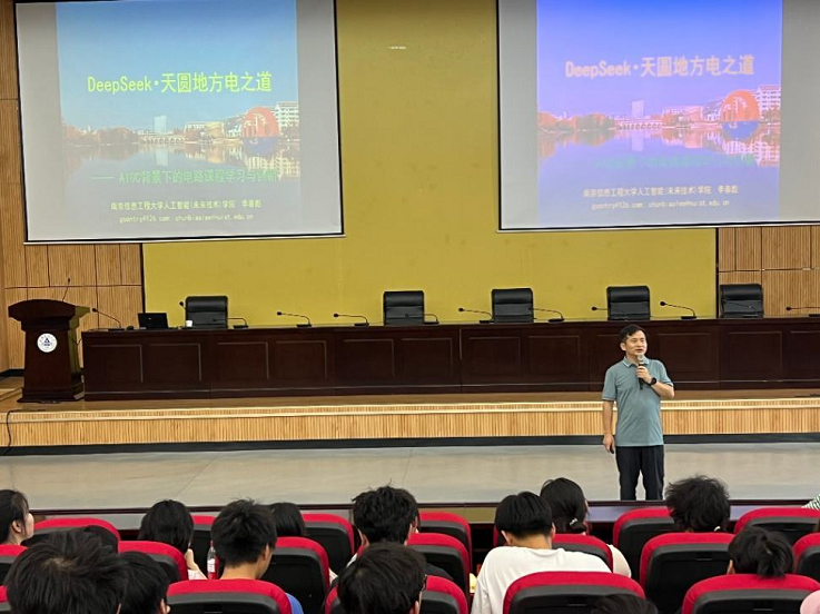 本网讯 2025年6月18日下午,电信学院特邀南京信息工程大学人工智能学院副院长李春彪教授在徽风楼二楼报告厅为2024级学生带来了一场别开生面的AI赋能课程学习报告会。报告以“DeepSeek 天圆地方电之道——AIGC背景下的电路课程学习与创新”为主题,吸引了300余名师生参与,现场气氛活跃热烈。