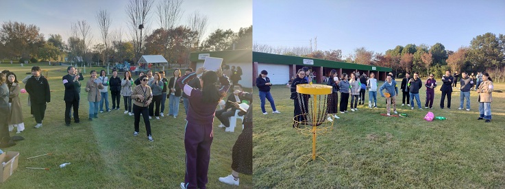 本次户外活动的核心环节围绕“寻趣”与“协作”展开。设置了“飞盘掷准”“你画我猜”“投壶”和“线上滚球”一系列需要紧密配合的挑战项目。在“线上滚球”中,队员们需要在规定时间内紧紧拉住绳索,同心协力让球在绳索上顺利滚动到目标地,考验的是团队的默契与节奏;在“你画我猜”中,大家争分夺秒,集思广益,共同破解图片谜题,展现了卓越的沟通与协作能力。活动现场,加油声、呐喊声、欢笑声此起彼伏,每一位参与者都全情投入,为了共同的目标而努力。平日里在讲台上严谨授业的教授,在办公室伏案工作的行政人员,此刻都化身为矫健的队员,在合作与竞争中释放激情,在绿水青山间展现了别样的风采。