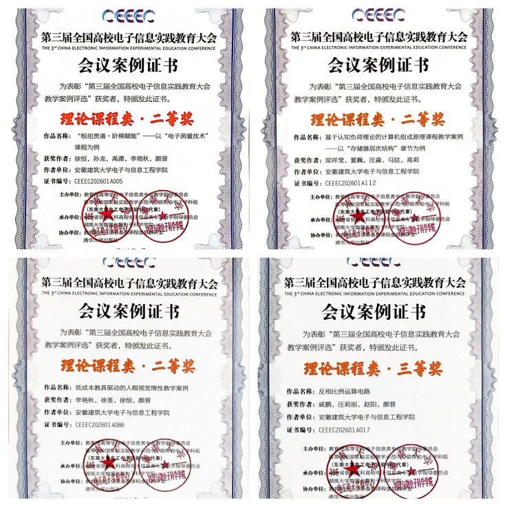 大会同期开展教学案例征集与评选活动,覆盖“理论课程教学案例”“实验课程教学案例”“产教融合教学案例”三大类别,是对高校教师教学改革能力、课程建设质量及实践育人效果的全面检验,吸引了全国多所高校的优秀教学团队参与竞争。电信学院高度重视此次评选,积极组织教师团队筹备申报。凭借先进的教学理念、扎实的改革实践以及突出的育人成效,学院在全国性评选中表现亮眼,最终斩获二等奖3项、三等奖1项、优秀奖1项的优异成绩。