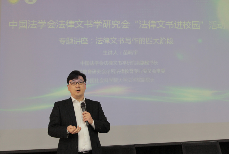 讲座中,苗鸣宇通过发布调查问卷的形式,结合生活实际提出问题,有针对性地引导学生进行思考,对同学们的回答一一点评,进而详细讲解法律文书写作的基础思维方法,推荐法律文书写作阅读书目,并着重强调法律实务实践活动的重要性。