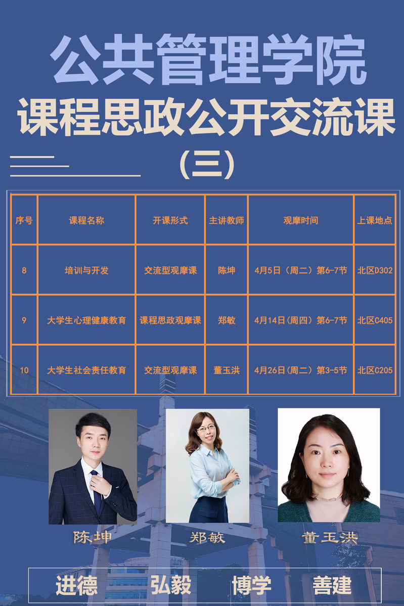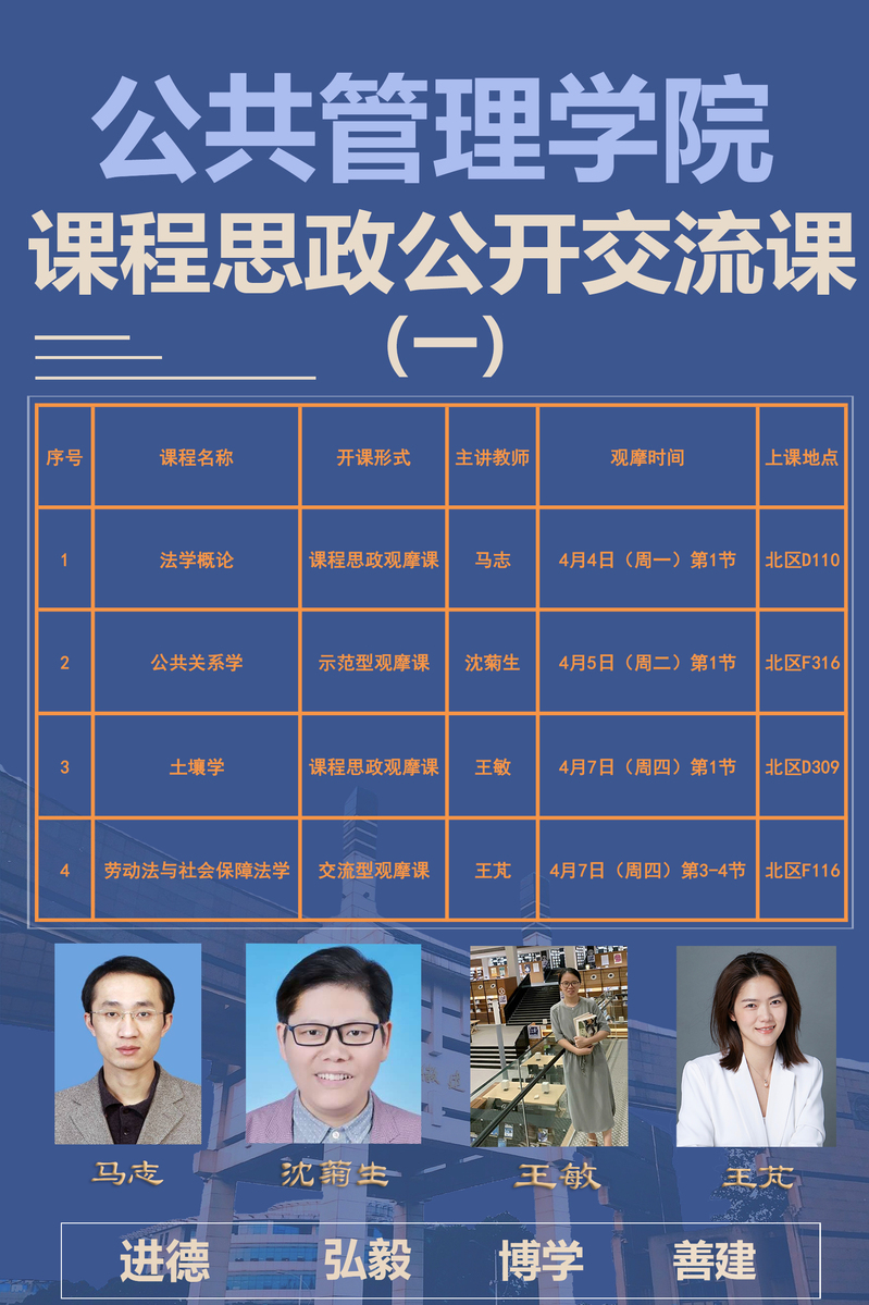 本网讯  为全面落实立德树人根本任务,推进课程思政教育教学改革工作,进一步发挥课堂教学的育人主渠道作用公管学院开展为期一月的课程思政公开交流课教研活动共有10位老师开设“课程思政”公开交流