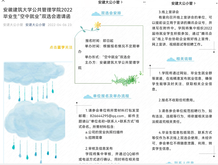 学院在网络平台发布“空中双选会”通告,通过广泛宣传和土管系教师的邀约,中国城市发展研究院、合肥工业大学设计院、合肥润田规划设计有限公司、安徽地源不动产咨询评估有限公司、南京国图信息产业有限公司五家企业单位积极报名参加招聘会。
