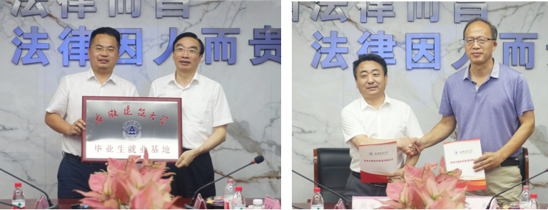 上海君悦(合肥)律师事务所主任罗平详细介绍了校企学科共建、产学研推进情况,期待在前期合作的基础上,持续在学生实训、毕业生就业等方面开展深度合作。会后,双方签署了就业实习实践基地协议,共同为就业实习实践基地揭牌。