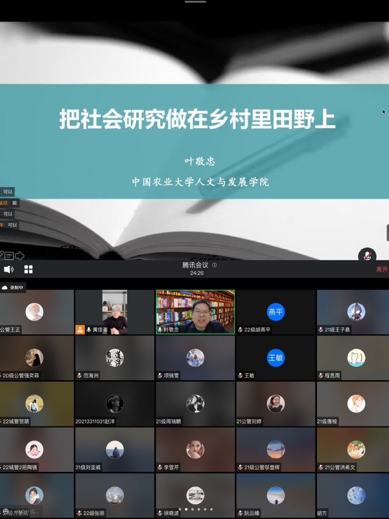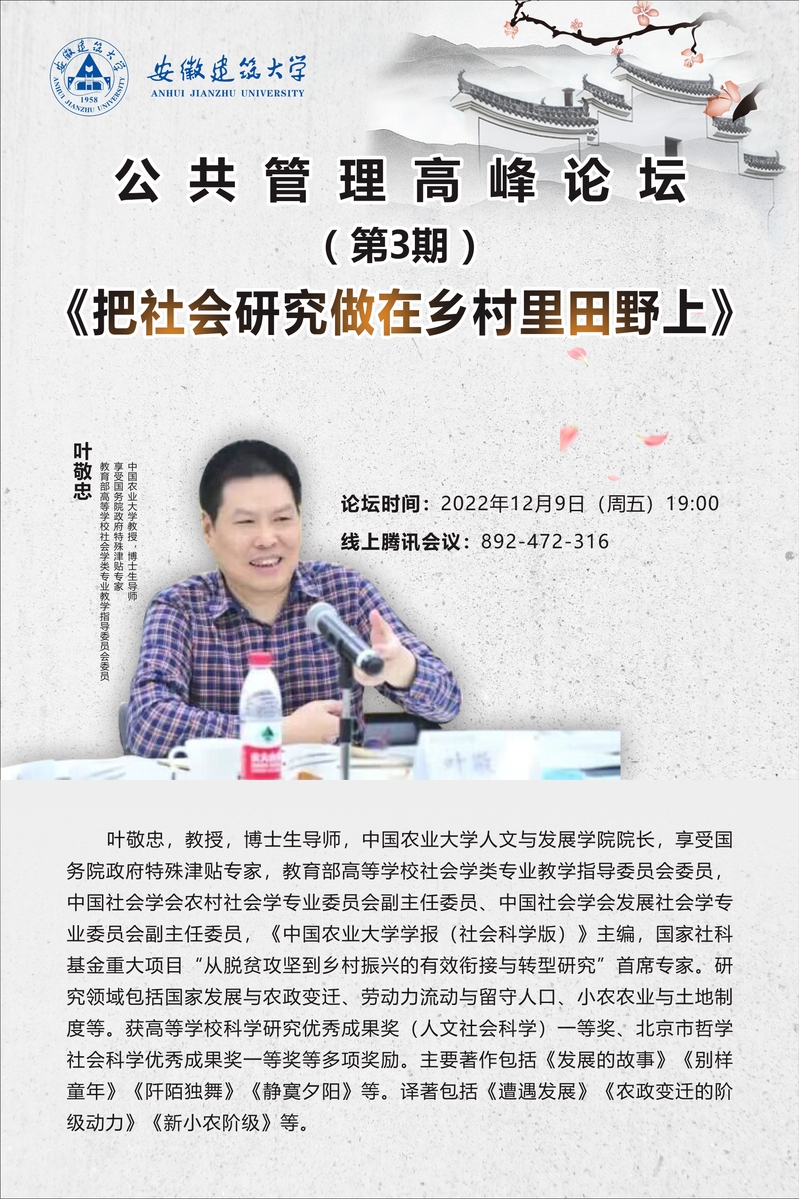 本网讯 为打造深度融合的学术交流平台,进一步推动国家基金申报工作,促进人文社会科学研究高质量发展,公管学院于12月9日线上举办了公共管理高峰论坛第3期。中国农业大学人文与发展学院院长、享受国务院特殊津贴专家叶敬忠教授受邀作了“把社会研究做在乡村里田野上”主题讲座。学院教师、研究生以及国内各兄弟院校师生共200余人参加论坛,论坛由公管学院院长黄佳豪主持。