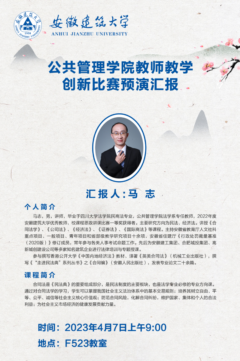 为进一步打磨课程思政教学创新内容,模拟真实参赛环境,针对性提升作品质量,4月7日上午,公管学院于beats365官方唯一北校区F523教室开展安徽省教师教学创新比赛预演汇报会,并邀请合肥工业大学于宝证教授、安徽大学张洪教授担任点评专家,学院相关青年教师参与观摩。