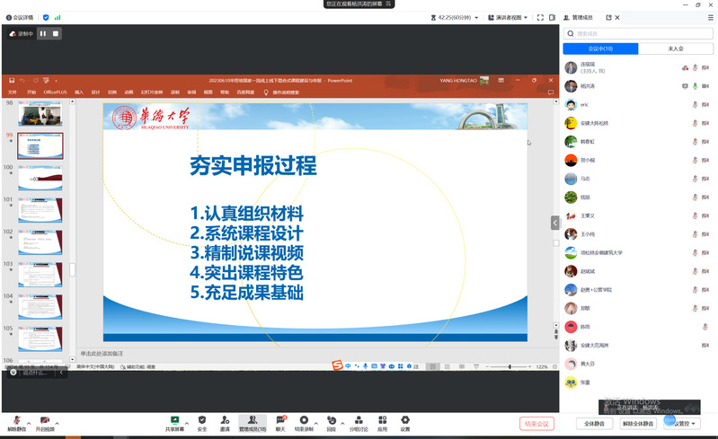 杨洪涛教授首先对国家一流课程申报准备工作进行辅导,提出要认真组织材料、系统设计课程、精制说课视频、突出课程特色、充足成果基础,并强调要转换角色,从专家视角审视申报材料,并详细解读了一流课程评审的标准要求。此后,土管系钱丽副教授、人社系陈松林教授、赵斌斌博士等代表课程申报团队,依次汇报当前课程申报工作进度、申报书及附件材料准备情况以及申报工作中存在的难点、疑点、痛点。杨洪涛教授采用“一对一”方式,对三个课程团队的申报书进行了点评,从赛道选择、团队搭建、历程呈现、内容重构、教学组织、效果评价、亮点提炼、优势熔炼、特色体现等优化完善,以及说课视频、课程实录等技巧和注意事项上,提出针对性指导意见,特别强调要材料“实打实”,相关课程教学团队成员及相关参与教师均表示受益匪浅。