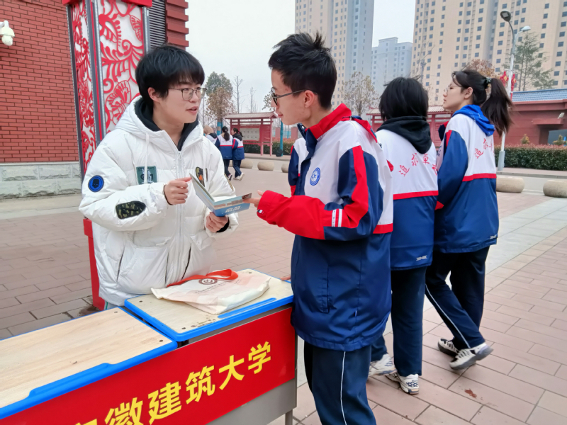 他们在庐江中学、芜湖一中、淮南二中、滁州中学、淮北一中、蚌埠二中等省内名校,衡水枣强中学、杭州第三高级中学、商丘市第一高级中学、平顶山四中和浮山中学等省外高中,广泛宣传建大的严谨治学和多彩生活,向高中生广撒憧憬象牙塔的星火。
