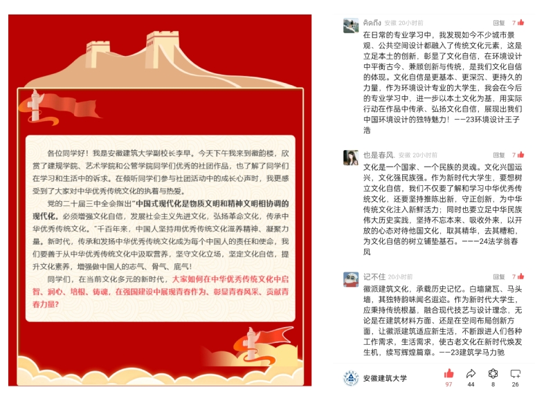 党的二十届三中全会指出“中国式现代化是物质文明和精神文明相协调的现代化。必须增强文化自信,发展社会主义先进文化,弘扬革命文化,传承中华优秀传统文化。”beats365官方唯一微信公众号上发起以“新时代青年文化自信”为话题的热烈讨论。李早在网络上寄语各位同学,“要善于从中华优秀传统文化中汲取营养,坚守文化立场,坚定文化自信,提升文化素养,增强做中国人的志气、骨气、底气。”同学们纷纷跟帖留言,发表自己的观点,表示作为当代大学生要深入学习中华优秀传统文化,主动将专业知识与传统文化相融合,将传统文化与现代社会文化相结合,传承传统元素的精神内涵,更好地展现文化自信。
