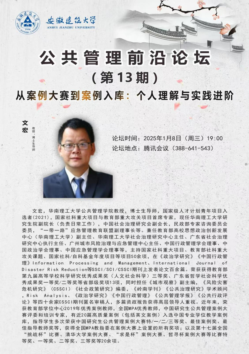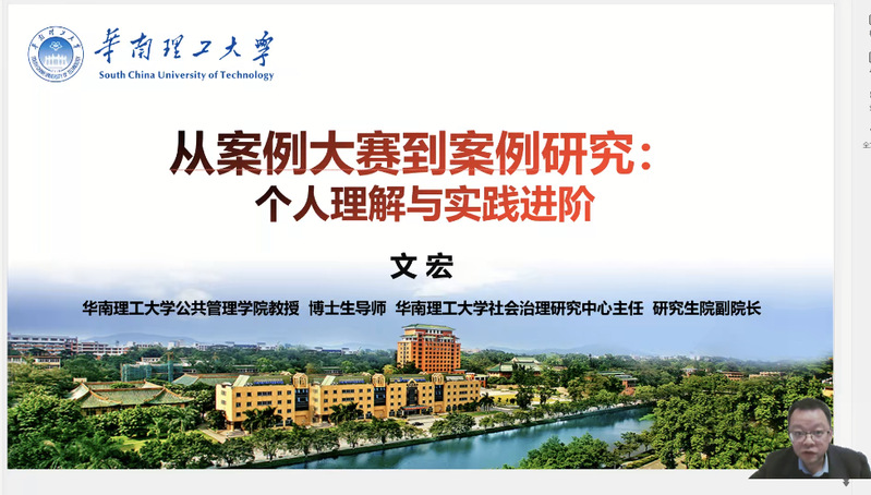 本网讯 为深化公共管理学科案例教学与研究,推动研究生案例分析能力提升,1月8日,公共管理学院组织研究生线上参加华南理工大学文宏教授主讲的公共管理前沿论坛(第13期)——从案例大赛到案例入库:个人理解与实践进阶,论坛由副院长王秉义主持。