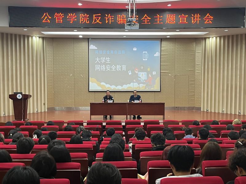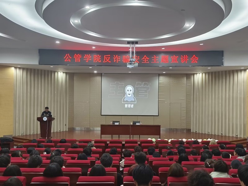本网讯 为深入贯彻落实学校安全工作会议精神,切实增强师生反诈防骗意识,3 月13日,公管学院在金寨路校区图书馆二楼报告厅举办大学生网络安全教育宣讲活动。活动特邀合肥市公安局政治部新闻中心周力警官担任主讲,活动由连瑞瑞副院长主持,学院200名师生代表参加。