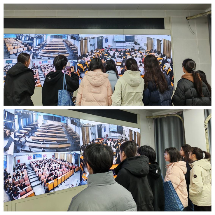 实地观摩明底线,凝聚公平应考思想共识。学院组织学生代表前往金寨路校区监控中心开展实地观摩活动。在工作人员引导下,学生代表现场观看教室监控系统运行实况,全面了解监控设备全覆盖、高清晰的技术特点,以及考试期间监控巡查的规范流程。工作人员重点讲解了监控系统在维护考场秩序、防范作弊行为中的关键作用,让学生直观感受到学校维护考试公平公正的坚定决心与强大力度。参与观摩的学生代表纷纷表示,将以此次观摩为契机,严守考试纪律,坚守诚信底线,共同维护考场秩序与公平正义。