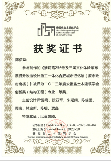 本网讯 近日,平台陈信堂老师的项目“淮河路256号及三国文化体验馆布展提升改造设计施工一体化合肥城市记忆馆(原市政府南楼)”荣获2023年度安徽省土木建筑学会创新奖(结构工程)专业一等奖。