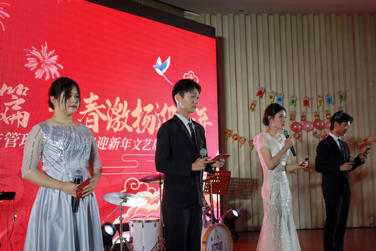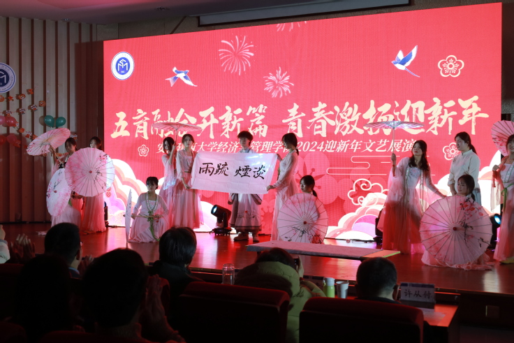迎新年文艺展演在平转立乐队开场歌曲串烧中进入高潮。本次晚会涵盖了歌曲、舞蹈、小品等多种表演形式。《烟雨行舟》和《Cake》《Drama》展现不同舞蹈艺术的魅力,独唱《偏爱》和古筝合奏《青花瓷》体现流行文化艺术的风采,小品《青春那些事》用富有感染力的表演带着大家重温那段充满理想、青涩与单纯的青春岁月。《想见你想见你想见你》《太阳》《C级浪漫》等节目编排精彩,充满热情与活力。创意舞台剧《风华正茂,恰少年》用光影效果,展现经管学子爱校荣校、乐观积极的精神风貌。