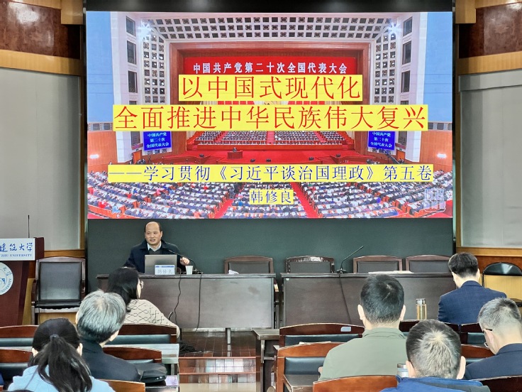 会上,韩修良以《以中国式现代化全面推进中华民族伟大复兴——学习贯彻<习近平谈治国理政>第五卷》为题,从“拓展天下胸怀”“紧扣中心任务”“把握根本遵循”“汇聚奋进力量”四个层面,深刻阐释了《习近平谈治国理政》第五卷的重大意义以及主要内容、理论创新和实践要求,为进一步深入学习贯彻习近平新时代中国特色社会主义思想提供了有力指导。